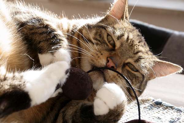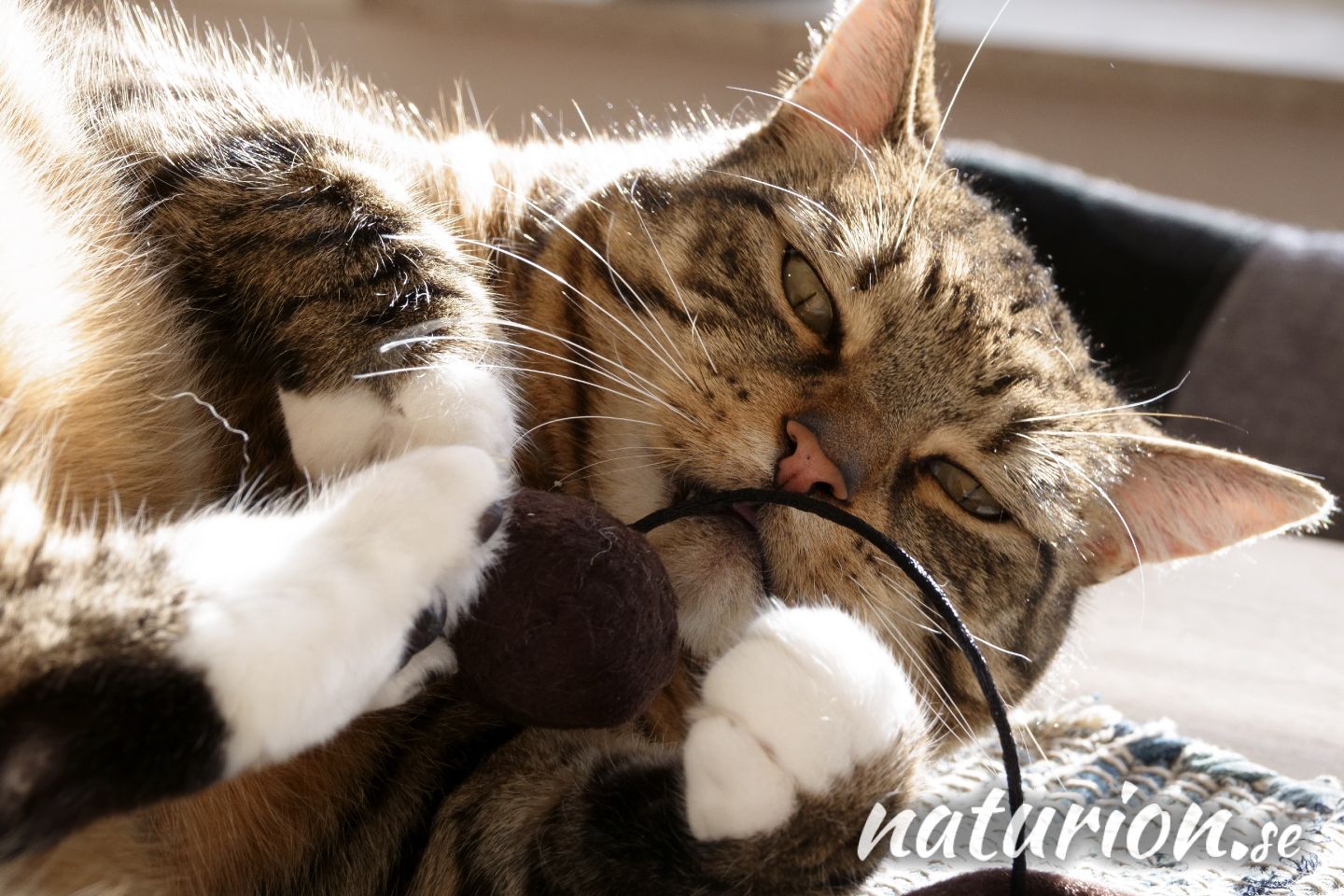 Eindelijk schijnt de zon weer eens! 😀 Dus ligt Mika lekker met een balletje te spelen op te tafel in de zon - wat wil je nou nog meer?